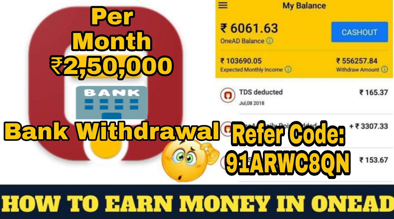Join OneAD Today. Few lucky new members will get Rs 100 bonus after 1 day of joining. Refer OneAD app and earn up to 2.5 lakh per month. Play games and win money. Use 91ARWC8QN refer code.