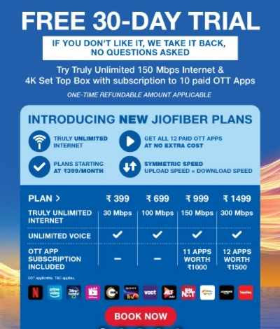 - Jio Fiber is providing No-Condition 30 Days trial of 150 Mbps, 4K Set Top Box with 10 OTT apps subscription for all new users.